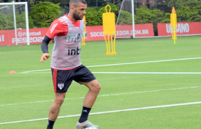 Após realizar trabalhos de fortalecimento muscular nos últimos dias, Daniel Alves voltou a treinar em campo com o elenco do São Paulo nesta quinta-feira (14), no CT da Barra Funda. O lateral-direito pode ser escalado no meio de campo no clássico contra o Santos, neste sábado, na Vila Belmiro, pela 33ª rodada do Campeonato Brasileiro. No treino desta quinta-feira, o espanhol Juanfran assumiu a posição na lateral direita, enquanto Daniel Alves foi deslocado para o meio. Ele deve atuar na vaga de Antony, que recupera-se de lesão na coxa esquerda e já estaria fora do clássico por causa de suspensão. Com isso, uma provável escalação do São Paulo para enfrentar o Santos tem: Tiago Volpi; Juanfran, Bruno Alves, Arboleda e Reinaldo; Jucilei, Tchê Tchê, Daniel Alves, Igor Gomes e Vitor Bueno; Pablo. Antes de preparar a equipe titular, o técnico Fernando Diniz dividiu o elenco em dois grupos. Os jogadores ofensivos realizaram trabalhos de finalização, enquanto os defensores fizeram uma atividade específica de marcação. Depois de duas derrotas seguidas em casa – para Fluminense e Athletico-PR -, o São Paulo encara o clássico contra o Santos como uma oportunidade de “mudar a maré”. A partida será realiza neste sábado (16), às 17 horas.