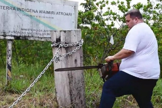 O deputado estadual Jeferson Alves (PTB-RR) derrubou ontem o bloqueio da base indígena que controla o acesso à BR-174, que liga Manaus (AM) a Boa Vista (RR). Com uso de uma motosserra e um alicate de pressão, o deputado cortou um tronco e uma corrente que eram usados pelos índios para controlar o acesso à rodovia. A BR-174 passa pela terra indígena Waimiri Atroari, onde vivem os índios kinja. Toda a ação foi gravada e divulgada pelo parlamentar nas redes sociais.