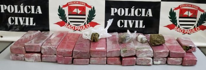 Foram apreendidos 24 tijolos de maconha e porção fracionada.