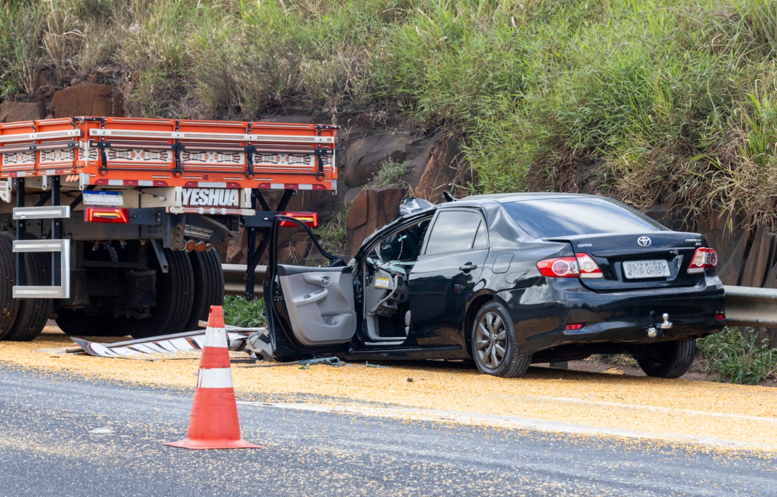 Um caminhão que vinha atrás reduziu velocidade e o Toyota Corolla que vinha atras acabou batendo na traseira, provavelmente o milho prejudicou a frenagem.