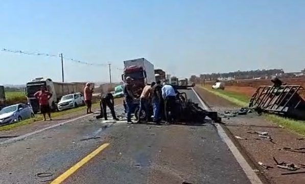 Com o impacto, uma roda lateral da carreta foi arrancada. A carretinha foi parar além do acostamento, do outro lado da rodovia. O carro ficou totalmente destruído.