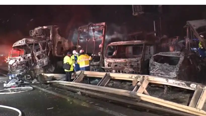 Um incêndio começou na extremidade do engavetamento, espalhando-se por 20 veículos, alguns dos quais foram completamente queimados. O incêndio foi extinto cerca de sete horas depois, informou a polícia.