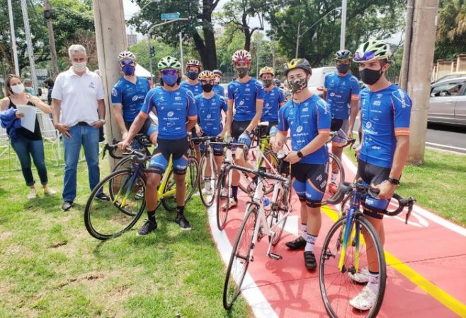 A Equipe de Ciclismo de Ribeirão Preto (São Francisco Saúde/Secretaria de Esportes) marcou presença na inauguração de uma ciclovia e de um corredor de ônibus na manhã desta quinta-feira (17), na Avenida do Café, zona Oeste de Ribeirão Preto.