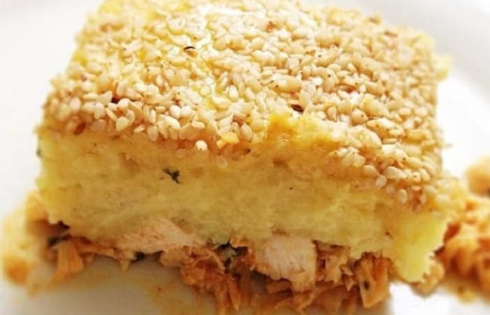 2. Depois coloque em um refratário grande de vidro uma camada de frango e outra de batata.