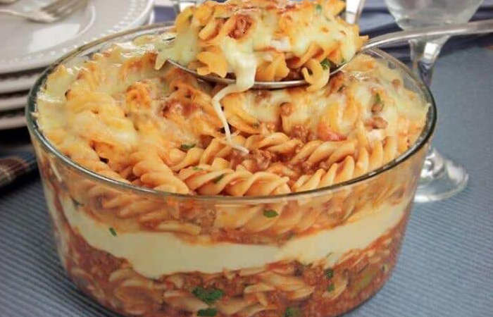 5. Para a montagem, em um refratário grande, faça uma camada com metade do macarrão, cubra com o creme de requeijão, coloque o restante do macarrão e polvilhe com a mussarela.