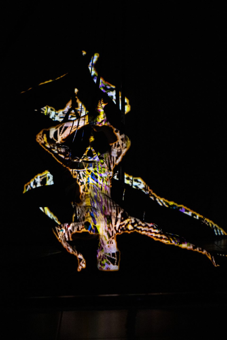 “CORPOMÁQUINA”: sons gerados por eletricidade muscular e imagens videomapeadas, projetadas em tempo real sobre o próprio corpo de um dos artistas em cena (Guilherme Di Curzio )