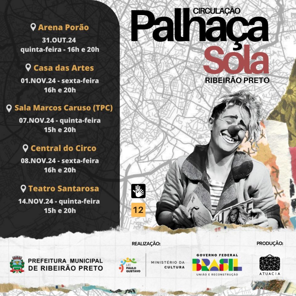 Palhaça Sola é um monólogo contemplado com o Edital nº 003/2023 Lei Paulo Gustavo Municipal e Edital Cultura em Ação – Programa Coletivo Municipal de Fomento às Artes – FMC-RP, Edital nº 001/2023, beneficiado pelo Fundo Municipal de Cultura de Ribeirão Preto. O conteúdo desta obra é de responsabilidade exclusiva do autor e não representa a opinião dos membros da Comissão Municipal de Incentivo à Cultura do Fundo Municipal de Cultura ou da Secretaria Municipal de Cultura e Turismo da Prefeitura de Ribeirão Preto.