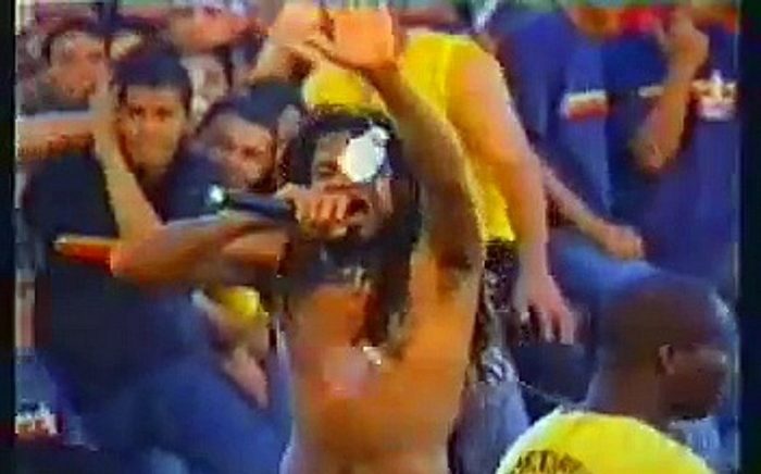 Assista ao momento em que Carlinhos Brown é alvo de uma série de objetos durante seu show no Rock In Rio 2001: