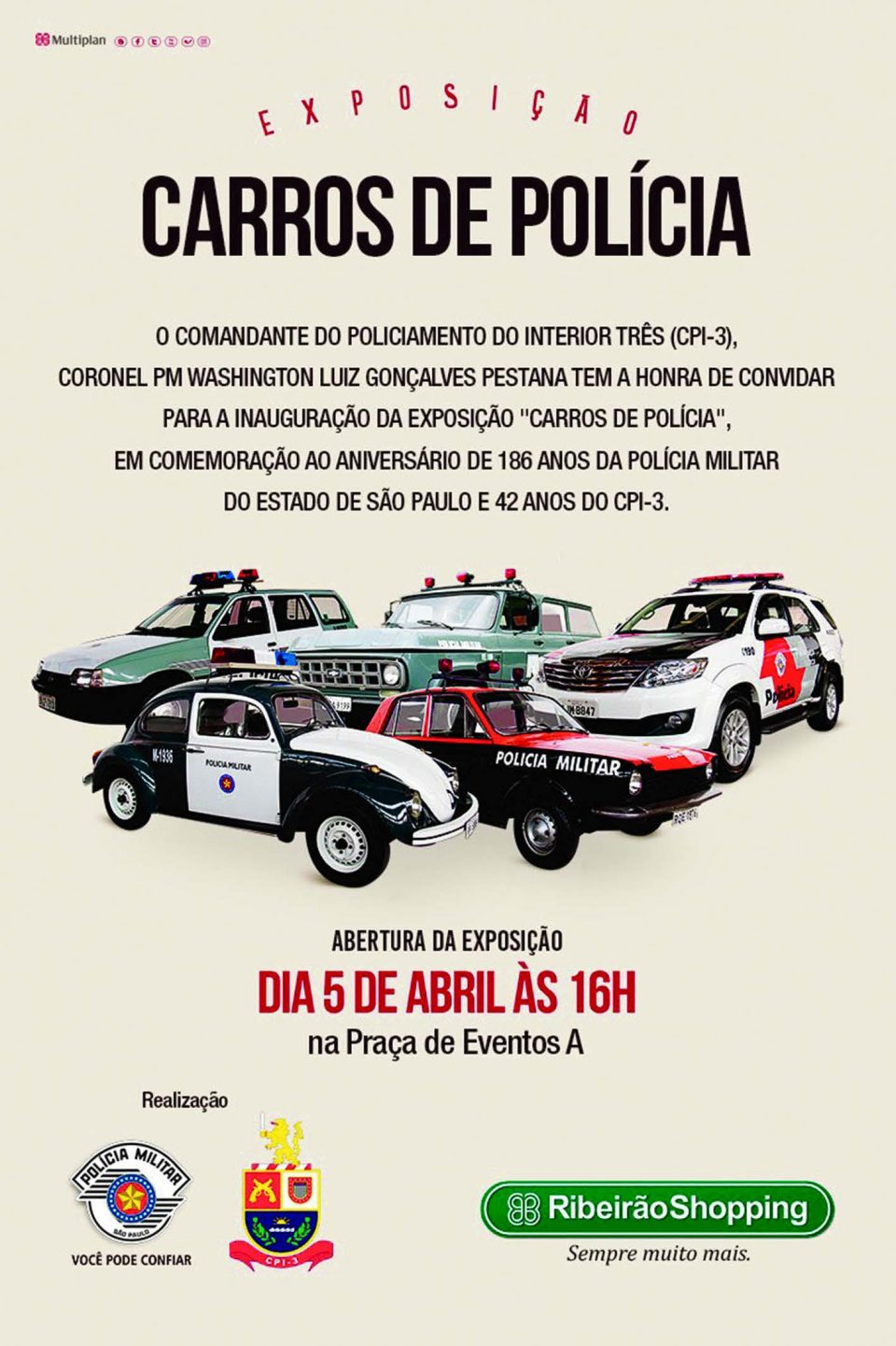 O RibeirãoShopping recebe algumas das históricas viaturas policiais em uma exposição que promete despertar lembranças entre os consumidores. A mostra “Carros de Polícia” tem entrada gratuita e acontece a partir desta quarta-feira (5), às 17 horas, e vai até o dia 22 de abril, na Praça de Eventos A, no Setor Terra Vermelha do empreendimento. A iniciativa marca os 186 anos da Polícia Militar do Estado de São Paulo e os 42 anos do Comando de Policiamento do Interior – Três, que comanda o policiamento de 93 municípios e 39 distritos de nossa região.
