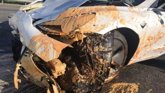 Felizmente, ninguém se feriu gravemente na batida, mas o Model 3 sofreu grandes danos e ficou coberto por um tipo de “molho”, segundo uma fonte.
