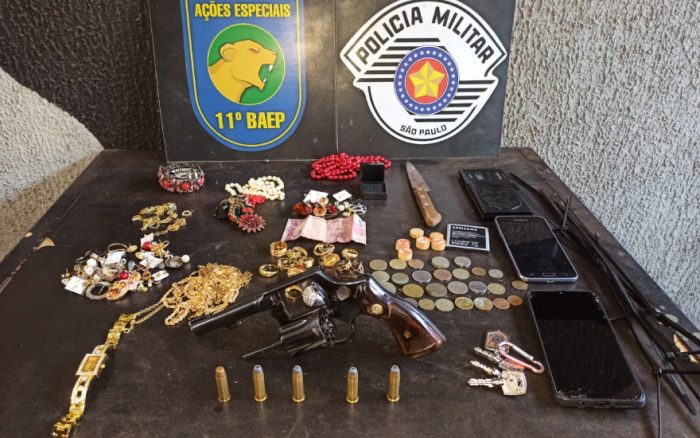 Os policiais então se encaminharam até a Rua Washington Luiz e fizeram cerco ao imóvel. Em determinado momento, os agentes pularam o muro da casa e, já em seu interior, conseguiram abordar os autores, que estavam em posse de um revólver e de uma faca.