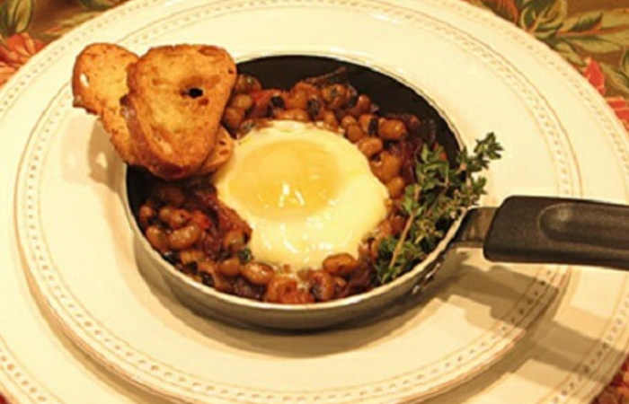 4. Agora acrescente o feijão e cozinhe por mais 3 minutos. Acrescente o molho de tomate, o caldo de galinha e o bacon e mexa suavemente.