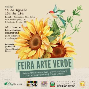Neste domingo, 18, Ribeirão Preto receberá a Feira Arte Verde, um evento dedicado à sustentabilidade e ao veganismo. Das 10h às 19h, o Espaço Cultural Cerâmica São Luiz se transformará em um ponto de encontro para entusiastas da cultura vegana e da produção artesanal sustentável.