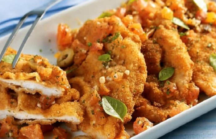 4. Passe os filés na farinha de trigo, no ovo batido e na mistura de queijo e fubá e doure-os dos dois lados em azeite.