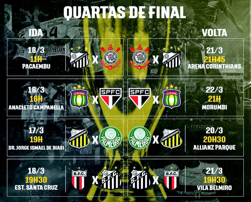 Corinthians e Bragantino começam a disputar as quartas de final no domingo, às 11 ho­ras, no Pacaembu. O segundo jogo, dia 21, às 21h45, será na Arena Itaquera. Também no dia 18, às 16 horas, o São Caetano recebe o São Paulo no Anacle­to Campanella. O jogo de volta está marcado para o dia 22, às 21 horas, no Morumbi.