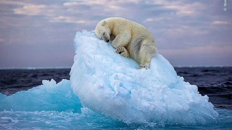 A foto de um urso polar dormindo em um iceberg ganhou o prêmio máximo em um concurso mundial de fotografias de vida selvagem.