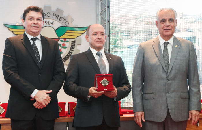 O diretor do Fórum, Dr. Ricardo Braga Monte Serrat, recebe a medalha das mãos do presi­dente da ACIRP, Dorival Balbino e do diretor do Tribuna, Eduardo Ferrari (FOTO: ALFREDO RISK)