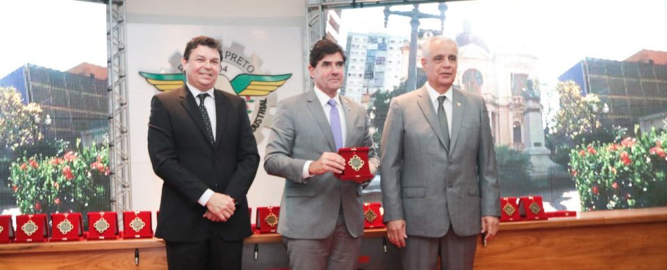 O atual prefeito, Duarte Nogueira recebe a medalha das mãos do presidente da ACIRP, Dorival Balbino e do diretor do Tribuna, Eduardo Ferrari