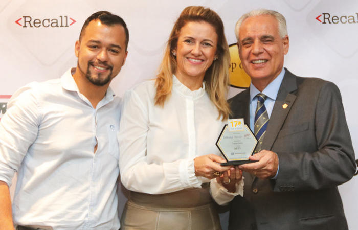 O supervisor de marketing da Rodonaves, Paulo Roberto Lataguia Junior e a vice-presidente da empresa, Vera Lúcia Marabin Naves, recebem a placa das mãos do presidente da ACIRP, Dorival Balbino.