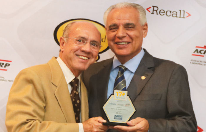 O superintendente do Daerp, Afonso Reis Duarte, recebe a placa das mãos do presidente da ACIRP, Dorival Balbino