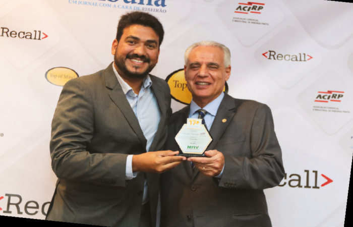 O gestor regional de vendas da MRV, Thiago Bandeira Carvalho, recebe a placa das mãos do presidente da ACIRP, Dorival Balbino