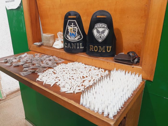 Ao se deslocarem até o local mencionado, os agentes se depararam com um homem que correu em direção a um matagal e conseguiu fugir. No entanto, este abandonou uma sacola que continha porções de droga. Além disso, em um arbusto daquele terreno também foram encontrados 500 pinos com cocaína e 56 trouxas de maconha.