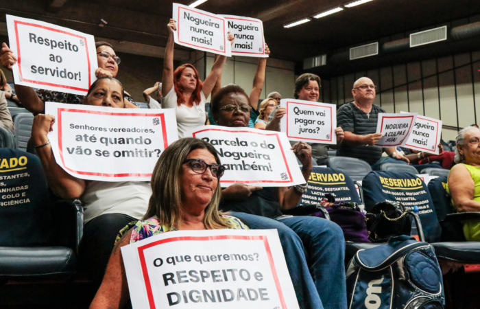 Um grupo de aposentados e pensionistas do Instituto de Previdência dos Municipiários (IPM) fez um protesto na ses­são da Câmara de Vereadores, na noite desta terça-feira, 1º de outubro. Portando cartazes com críticas ao prefeito Duarte No­gueira Júnior (PSDB), e ao lado de representantes do Sindicato dos Servidores Municipais de Ribeirão Preto (SSM/RP), eles foram ao Legislativo pedir apoio aos parlamentares contra a deci­são da administração de parce­lar os salários de setembro.