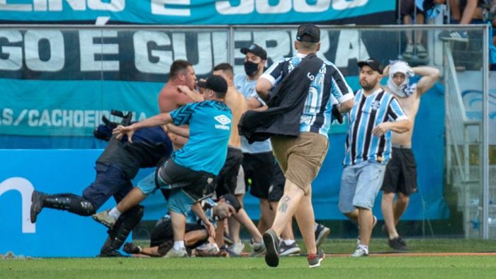 O relato ainda menciona as agressões entre gremistas e palmeirenses nas arquibancadas. “Em outro setor, nas cadeiras superiores, alguns torcedores da equipe do Grêmio FBPA e SE Palmeiras trocaram socos, mesmo separados por uma grade de proteção, logo após, foram contidos pelos seguranças do estádio e se dispersaram”, escreveu.