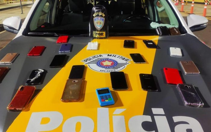 Durante essa vistoria, os policiais rodoviários encontraram, enrolados em roupas sujas, diversos telefones celulares. Alguns destes, ao serem pesquisados no Terminal Móvel de Dados (TMD), apresentaram registro de ocorrência de roubo e furto pela cidade de Franca.