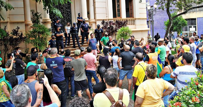 Desde a zero hora desta quarta-feira (17), e até domingo, 21 de março, Ribeirão Preto permanecerá em “lockdown”, com o confinamento de pessoas e a suspensão de atividades não emergenciais. O grupo levou bandeiras do Brasil para a porta do Palácio Rio Branco e fez muito barulho. Um novo ato está marcado paras 10h30 desta quinta-feira (18)