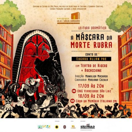 Neste final de semana, na sex­ta-feira (17) e no sábado, 18 de se­tembro, o projeto Leitores em Ação (LEA) estreia mais uma leitura dramática. Desta vez, a obra apre­sentada será “A máscara da Morte Rubra”, de Edgar Allan Poe (1809- 1849), com direção de Monalisa Machado e do Coletivo Fuligem.