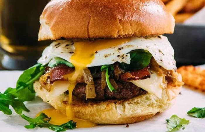 7. Coloque o hambúrguer e os temperos por cima (não tempere o outro lado). Não pressione a carne para evitar a perda dos sucos.