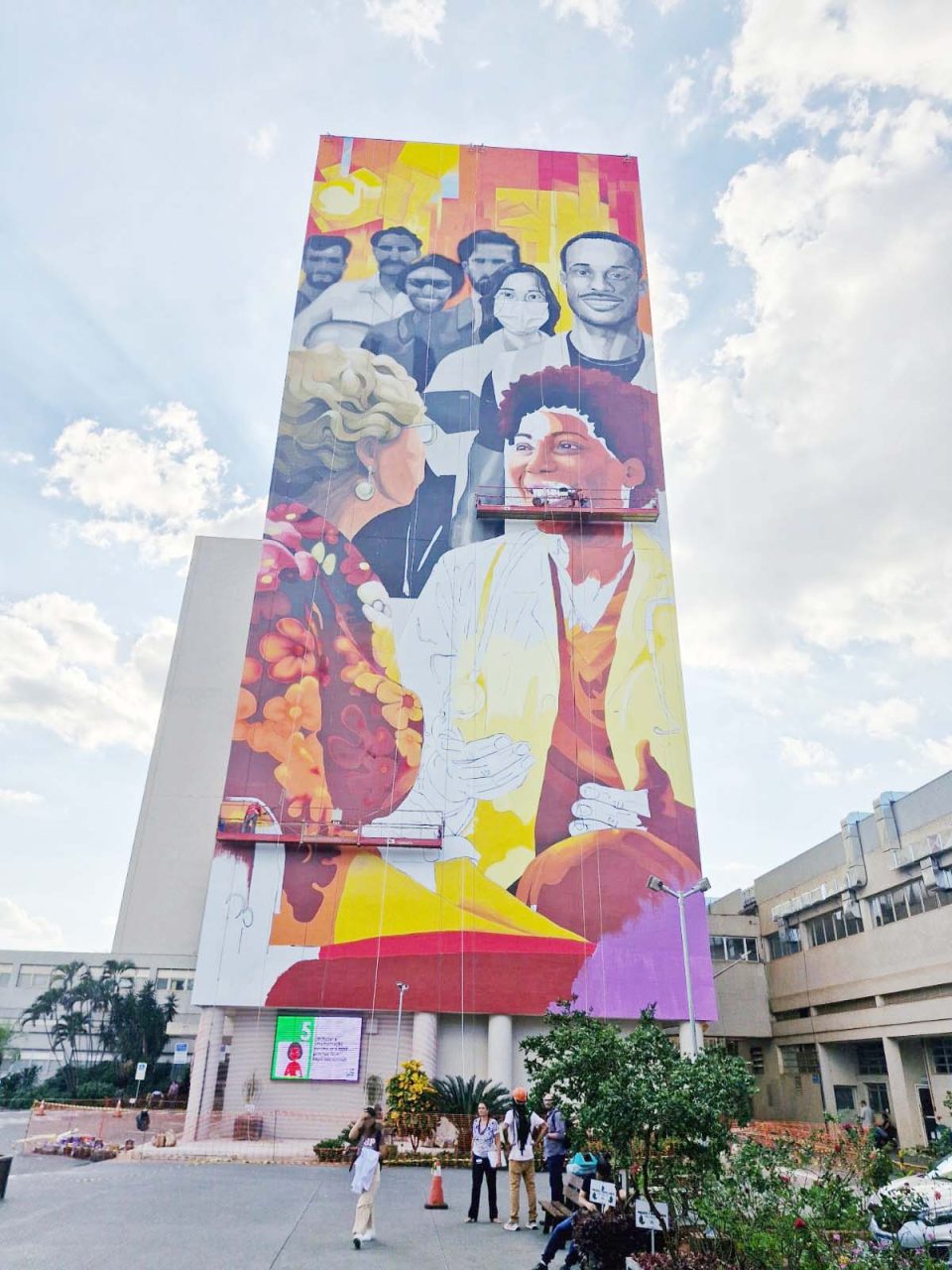 Nas últimas duas semanas, um espetáculo visual tem se desenrolado na entrada principal do Hospital das Clínicas de Ribeirão Preto, capturando a atenção de todos que passam por ali. Homens, suspensos em plataformas, trabalham lado a lado em uma das fachadas do edifício, transformando uma imensa parede de 828 metros quadrados – 18m de largura por 46m de altura – em uma tela viva.