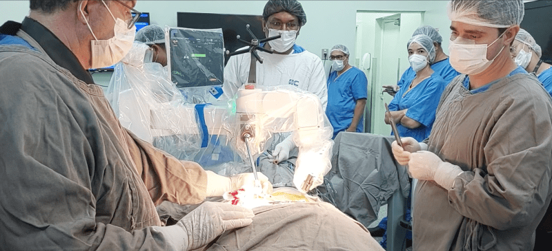 Cirurgia – Antes da cirurgia foi feito um planejamento minucioso utilizando exames de imagem, que permite programar com exatidão o posicionamento dos implantes. Durante o procedimento, o cirurgião é guiado pelo robô para executar a colocação dos implantes com a máxima precisão, contando com a visualização em tempo real através do sistema de navegação.