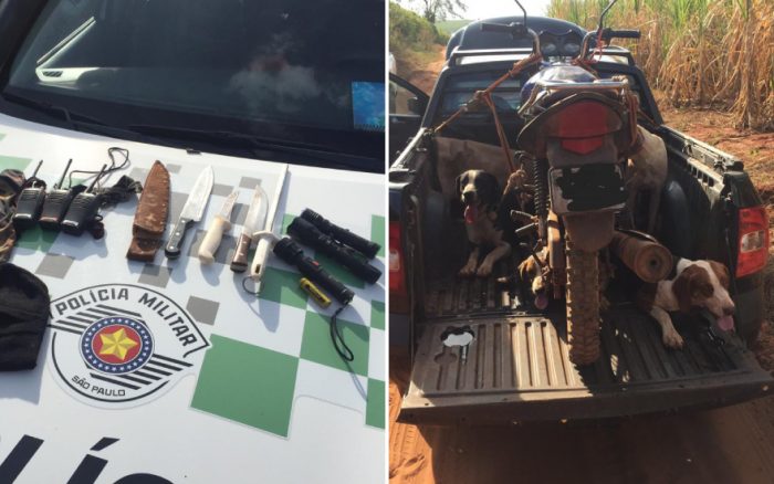 Na oportunidade, junto do suspeito, foram encontrados quatro cachorros treinados para caçar, além diversas facas, amolador, lanternas e rádios comunicadores.