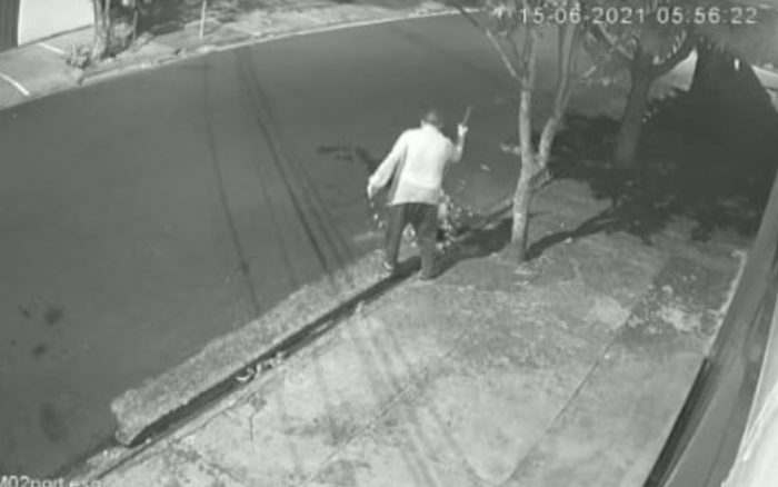 Uma gravação feita por câmera de segurança registrou o crime cometido pelo autor, que desferiu golpes com uma pá contra o animal