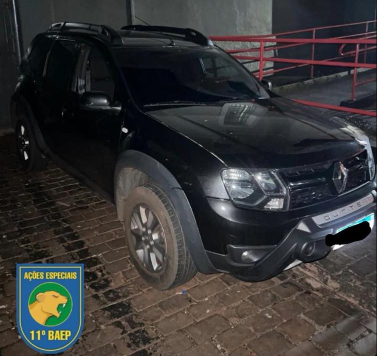 Uma viatura do Batalhão de Ações Especiais de Polícia (BAEP) avistou um Renault Duster preto circulando em alta velocidade pelas ruas do bairro. Fizeram o acompanhamento e abordaram o motorista.