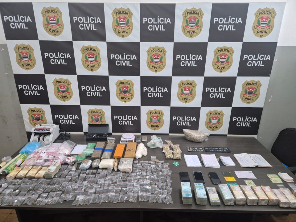 Policiais civis, militares e federais visitaram dois endereços do suspeito de ser grande traficante na região e, além de drogas, apreenderam R$ 300 mil em espécie (Foto: DEIC/Divulgação)