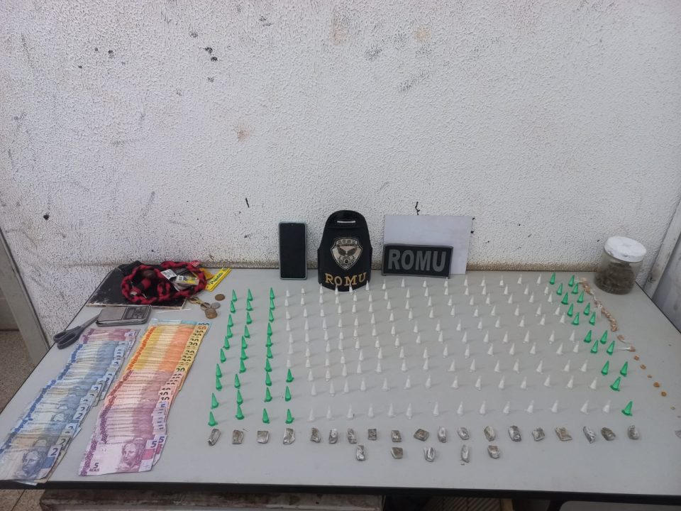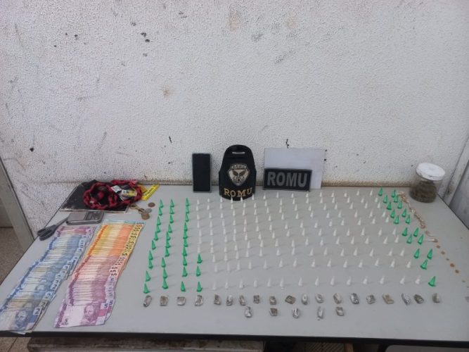 Ele foi abordado ainda no interior da comunidade. Durante revista pessoal, os agentes encontraram em uma bolsa que ele carregava 198 pinos de cocaína, 20 pedras de crack, um pote com maconha e R$ 720 em espécie.