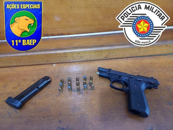 Policiais Militares prenderam um homem com uma pistola PT calibre 380 marca Taurus. A prisão foi feita por uma equipe do 11º Batalhão de Ações Especiais de Polícia (BAEP) na noite de ontem, no bairro do Ipiranga, zona Norte de Ribeirão Preto.
