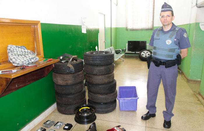 Foram apreendidos módulos de veículos diversos, estepes, roda de ferro, lanterna traseira de um gol, aparelho de som e um painel.