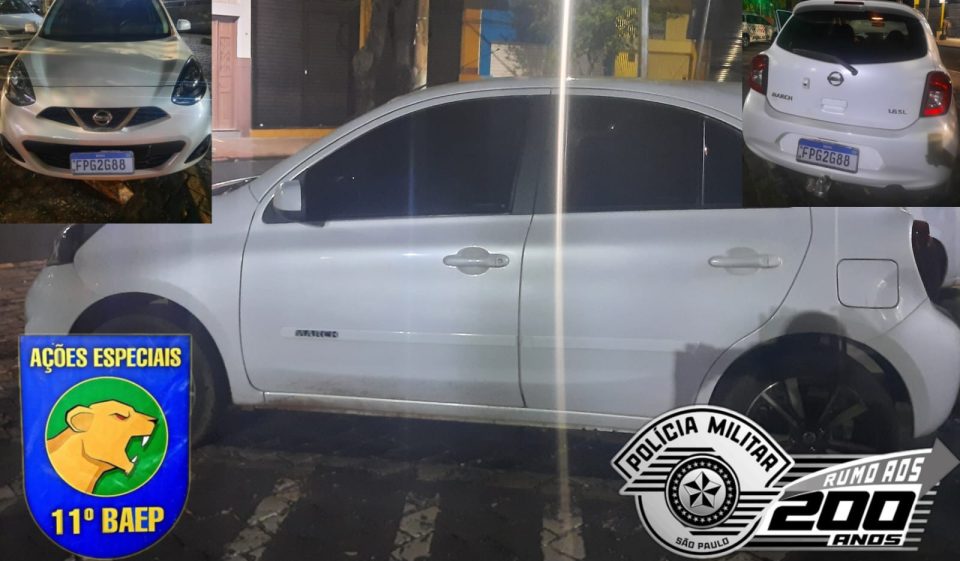 O suspeito levou os agentes do BAEP até o local onde estava um veículo Nissan March branco com placas clonadas, que apresentavam divergência com a numeração do chassi. Os PMs encontraram as placas verdadeiras no porta-malas do carro. O veículo foi furtado em Ribeirão Preto no dia 30 de agosto e havia sido transformado em “dublê”.