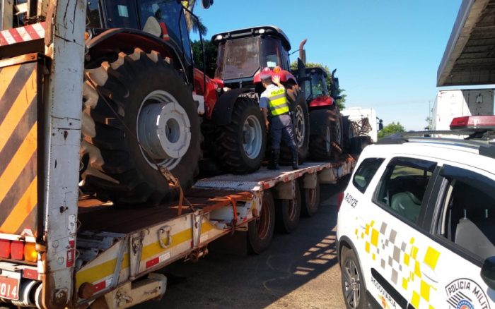 Diante do roubo, agentes do policiamento rodoviário iniciaram o patrulhamento pela rodovia e, em determinado momento, se depararam com uma carreta que carregava, sobre a prancha, três tratores com características similares aos subtraídos.