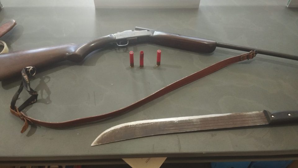 Durante a busca no imóvel, o suspeito foi encontrado deitado na cama e ao lado de uma espingarda calibre .36 e um facão. O facão, a arma de fogo, além de dois cartuchos intactos e um deflagrado foram apreendidos.
