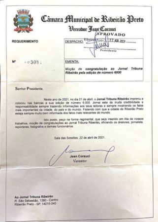 O vereador Jean Corauci (PSB) apresentou um requerimento (3081/2021), de congratulações ao jornal Tribuna Ribeirão, por sua edição número 6.000 (21 de abril), na Câmara Municipal de Ribeirão Preto. Em sua justificativa, o vereador ressalta o trabalho “de muita credibilidade e responsabilidade, cobrindo o que há de mais importante em Ribeirão Preto, no Brasil e no Mundo”.