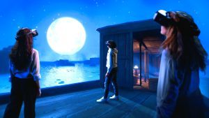 Visitantes utilizam equipamentos de realidade virtual durante a experiência imersiva que simula uma viagem ao interior da pirâmide de Quéops | Divulgação