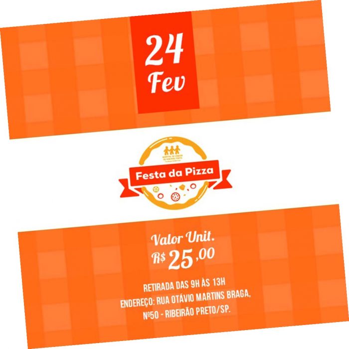 O Hospital de Câncer de Ribeirão Preto realiza, no próximo dia 24 deste mês, a Festa da Pizza, evento que visa arrecadar fundos para a instituição. As pizzas estão sendo vendidas – a um preço único de R$ 25 – pelo grupo de voluntariado pelo telefone (16) 3878-9700 e os vouchers também podem ser adquiridos diretamente no hospital.