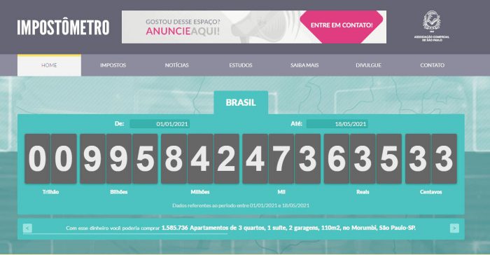O Impostômetro da Associação Comercial de São Paulo (ACSP) vai alcançar nesta quarta-feira, 19 de maio, às 7h53, a marca de R$ 1 trilhão em impostos arrecadados desde o primeiro dia do ano pelos governos federal, estadual e/ou municipal. Marcava R$ 995,84 bilhões às 16h11 desta terça-feira (18).