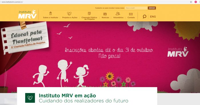 O Instituto MRV abriu, até o dia 31 deste mês, as inscri­ções do Educar para Transformar – 5ª Chamada Pública de Projetos, voltada para projetos nas cidades em que a MRV possui empreendimentos lançados ou em construção. Os pro­jetos devem trabalhar a educação como geradora de transfor­mação social, contemplando o Objetivo de Desenvolvimento Sustentável 4 (ODS 4). A avaliação dos projetos acontecerá de 5 a 30 de novembro e será realizada por uma comissão que levará em conta critérios como a realidade da comunidade, áreas de atuação do programa e potencial inovador, entre outras características. As inscrições devem ser feitas no site www.institutomrv.com.br.