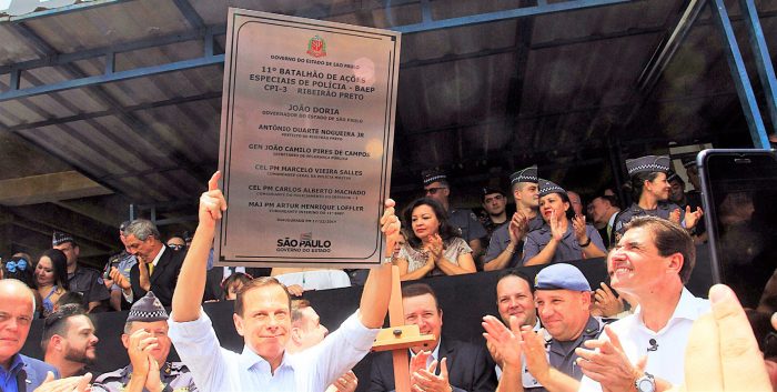 Durante a visita a Ribeirão Preto para inauguração do Batalhão de Ações Especiais da Polícia Militar (Baep), a equipe do governador João Doria (PSDB) teve muito trabalho para evitar que o tucano fosse abordado por alguns manifestantes que tentaram se aproximar dele durante a cerimônia.